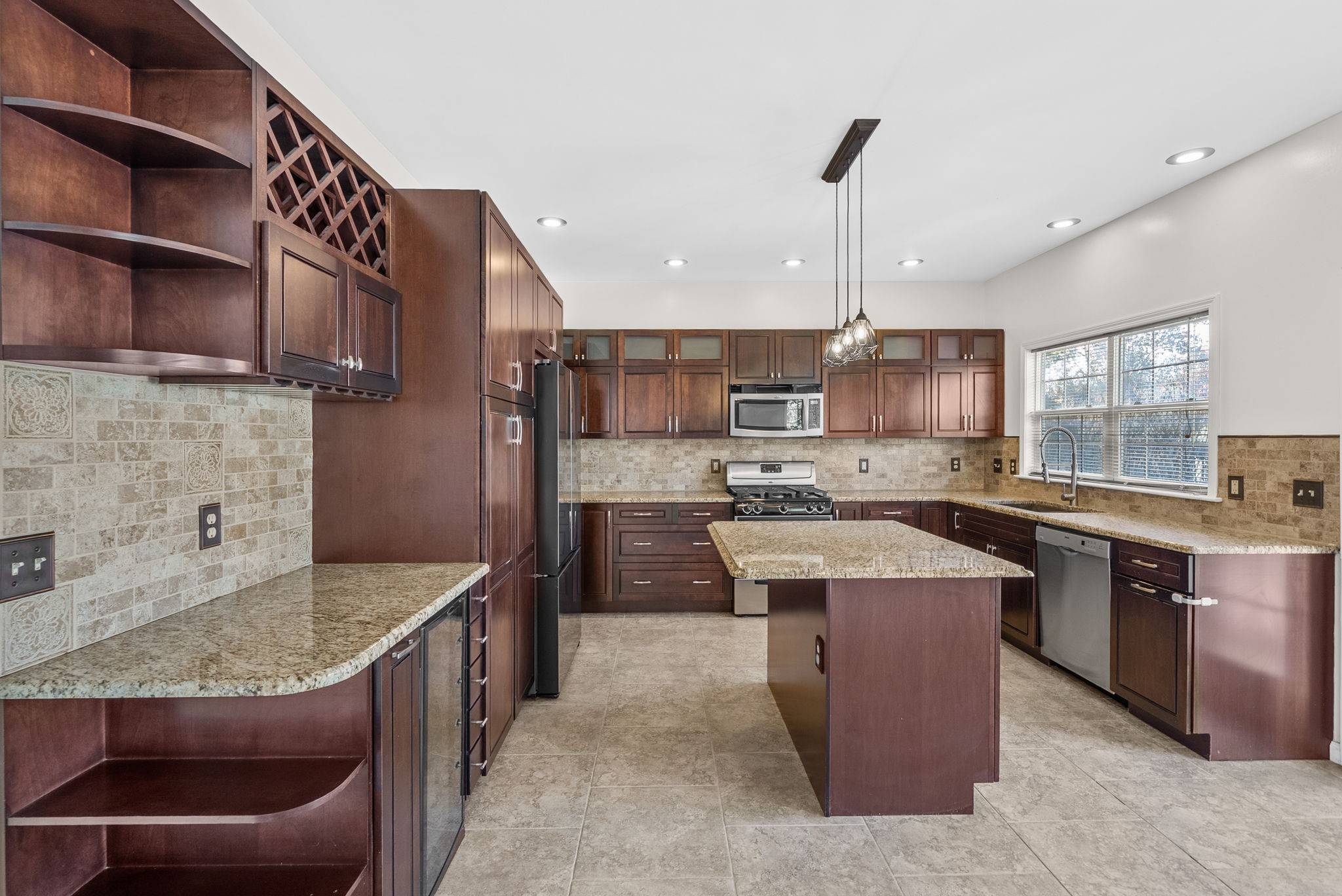 The main level includes two offices or flex rooms, a formal dining room, a large living room, a half bath, and a breakfast nook that fits modern living. The kitchen features stainless steel appliances, a 2024 Samsung Bespoke refrigerator, a wine fridge, and generous counter space that opens to a spacious living room with a cozy fireplace.
